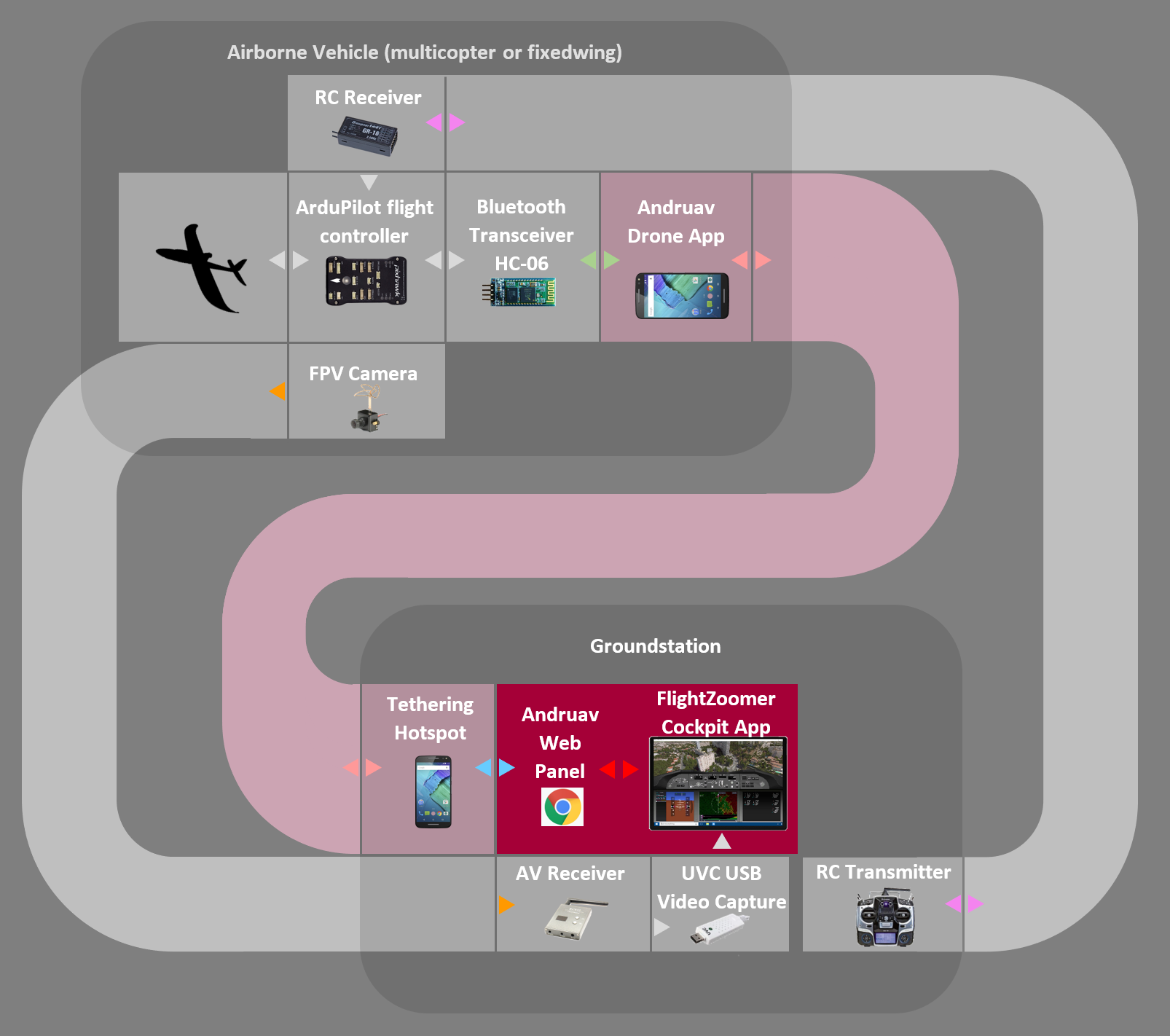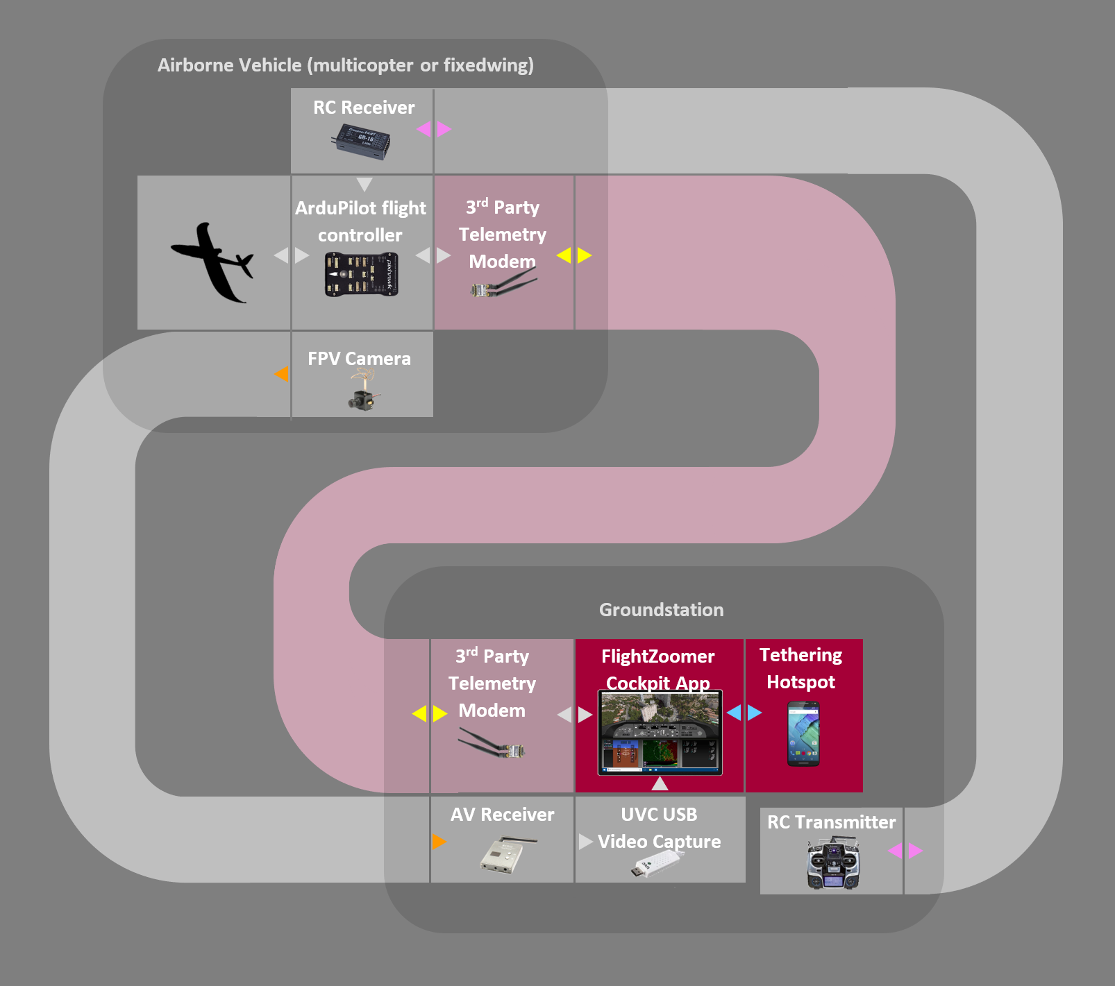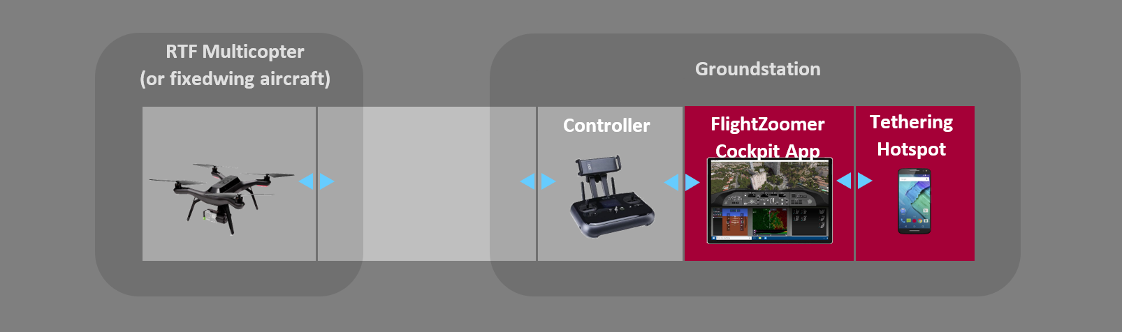 In this setup the cockpit app is connected with an RTF (ready-to-fly) multicopter. Smallest possible FlightZoomer footprint with only the cockpit app added.