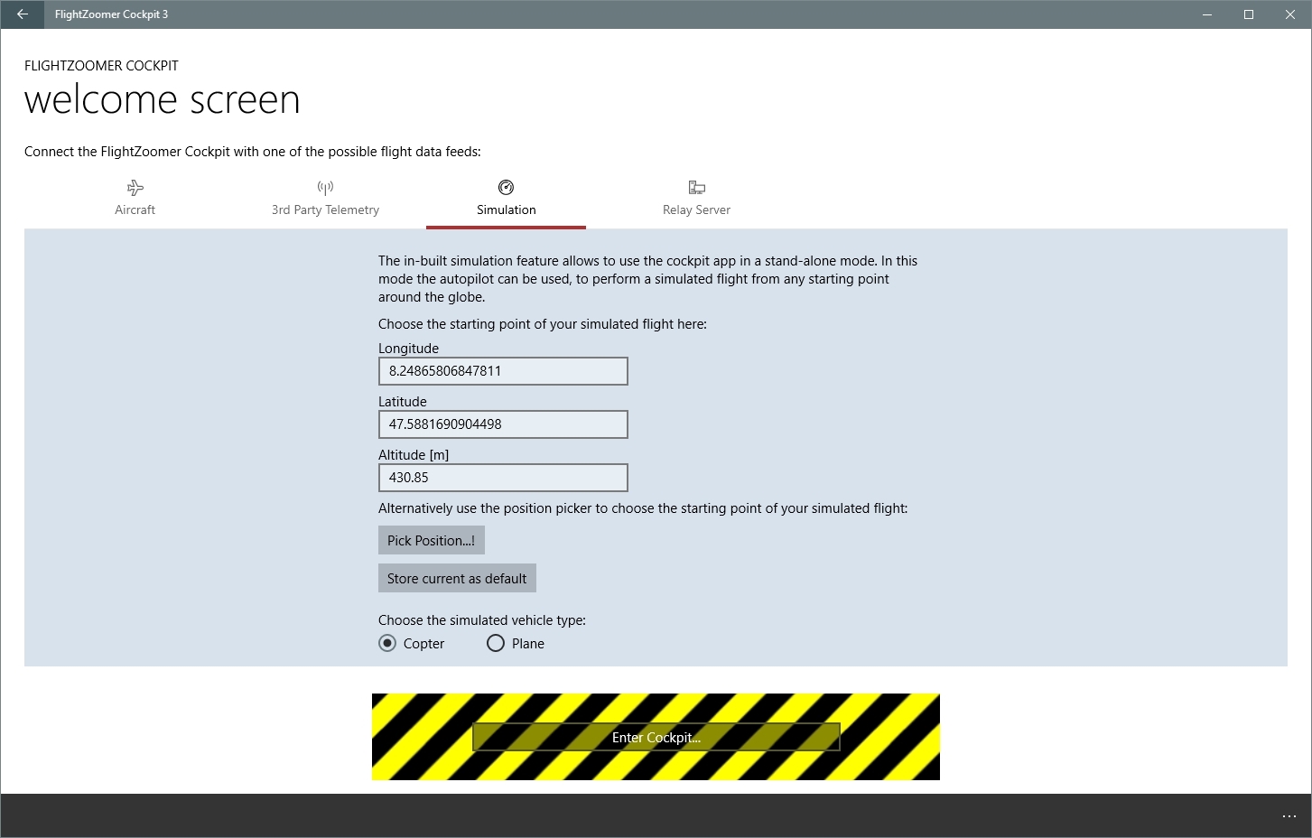 The FlightZoomer cockpit app has a simulation mode, that conveniently allows to get aquainted with the most important features.