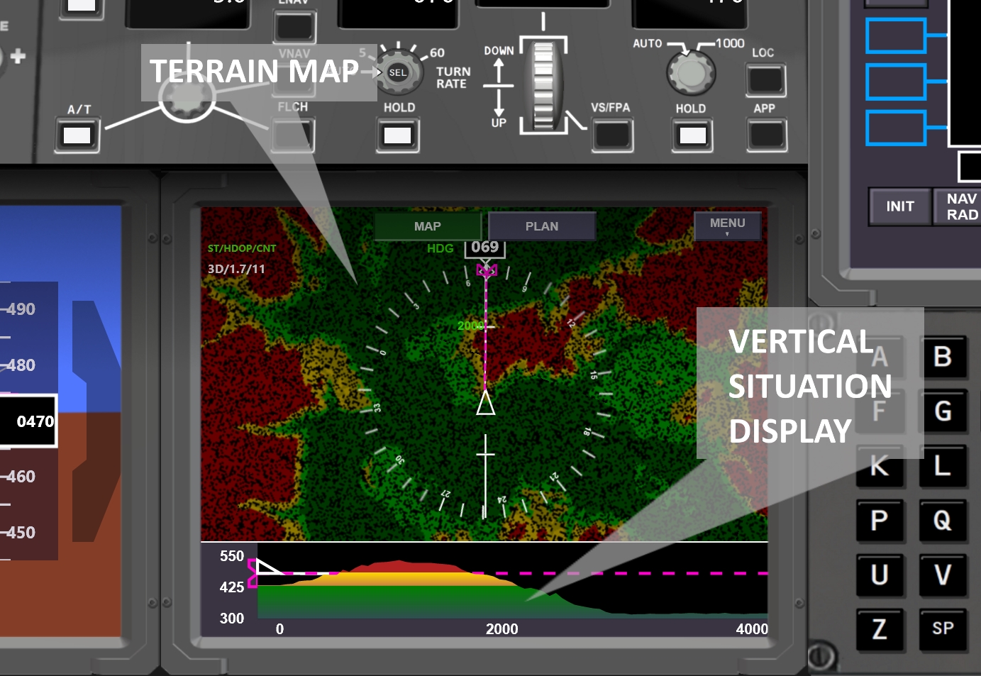 The terrain map and the vertical situation display provide excellent terrain awareness. The colors indicate the terrain elevation relative to the current aircraft altitude: