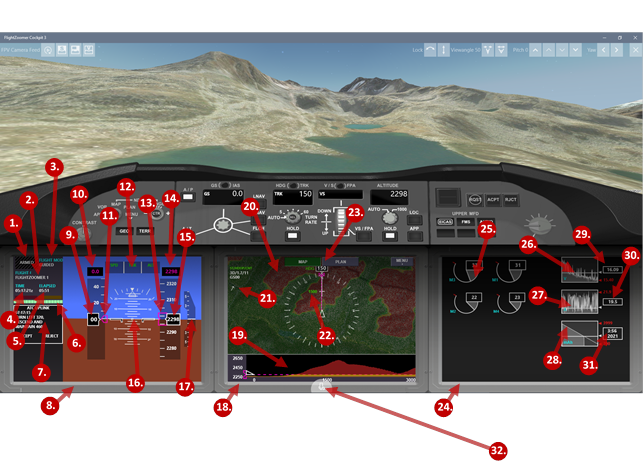 The EICAS shares the 3rd display with the FMS or the audio panel. Switching between theses displays/panels is done on the glareshield with the EICAS-, FMS- and AUDIO-buttons. |