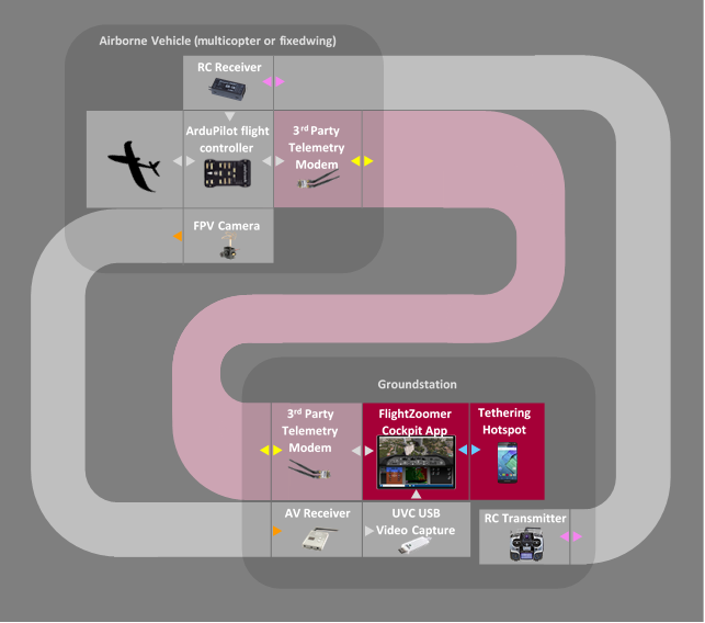This system topology is interesting for users, who already have a radio telemetry setup. Even though internet access is not needed for air-to-ground communication, the cockpit app preferably still has internet access (e.g. via a tethering hotspot) to support the synthetic FPV view or to fetch terrain elevation data (offline operation without these features is possible though).